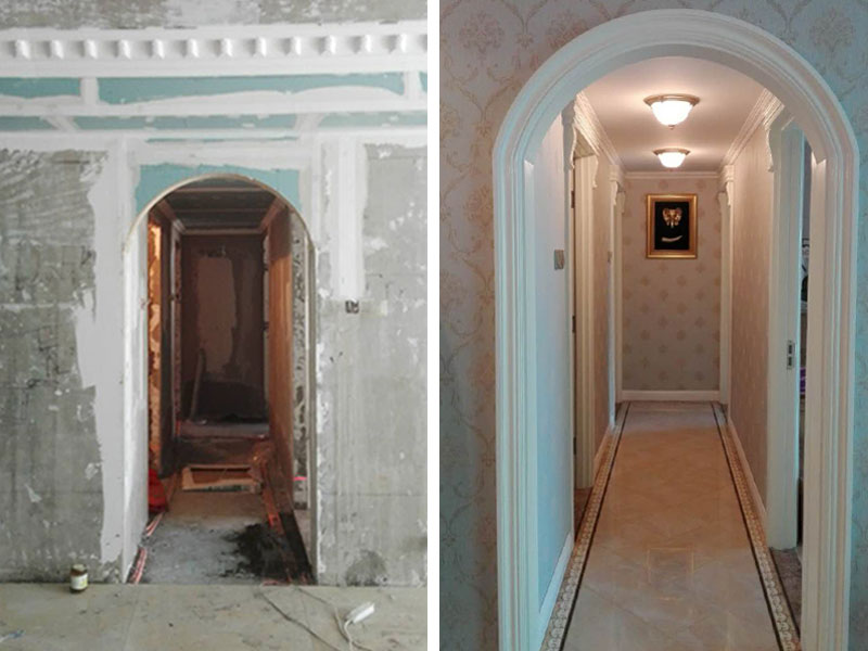 左圖是裝修前的過道拱門,右圖是精心設計裝修的新拱門,前后的對比是不是有很大的變化呢,幕前所有的呈現(xiàn)永遠都是美麗的,漂亮的,只因有幕后設計師和工長工人們的不懈努力,才有這最后完美的展現(xiàn),那么讓我們一起走進海晟名苑15號樓3樓吧。