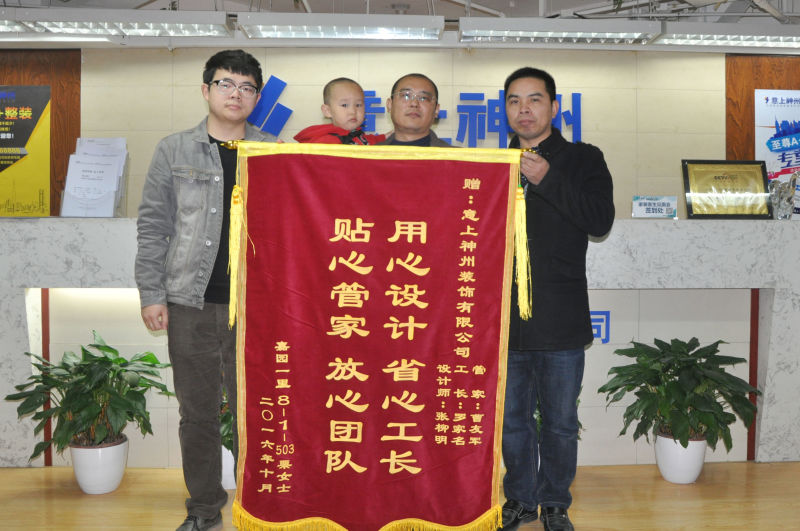 付出的汗水和收獲的耕耘永遠(yuǎn)是成正比的,粟女士被設(shè)計(jì)師和工人的辛勤努力深深地打動(dòng)的,提議來(lái)公司送來(lái)一面錦旗,能得到客戶的認(rèn)可和嘉獎(jiǎng),我們深感欣慰與喜悅,我們一定會(huì)矢志不渝的提高服務(wù)質(zhì)量和裝修水準(zhǔn),您的一份信任,還您整個(gè)家園。